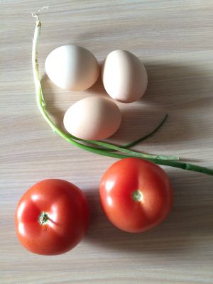 准备好西红柿 鸡蛋 食材非常重要 西红柿选比较熟透那种 捏起来很硬的会很酸 汁水也太少 还得要几棵小葱