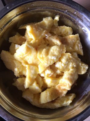锅中放油开中小火 油热倒蛋汁 需要让鸡蛋成块 之前不能翻动