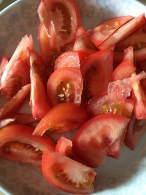 把鸡蛋打散,西红柿切块。