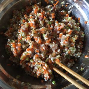 把材料全部剁碎,然后把泡好的糯米也放到一个盘子里,适当要大一点的盘子,因为东西都要拌均匀,大点的盘子比较好,然后加入油,盐,酱油材料就弄好了!