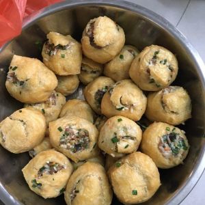 将泡好的糥米和肉馅混合。豆腐切成大块,下油锅煎至两面金黄。