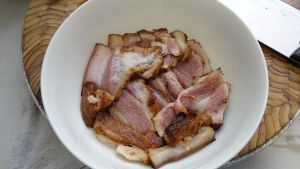 大块的五花肉放水煮熟,煮五六分钟差不多了,这里忘记拍照片了!然后把锅里放一点点油,油少一点整块放里面,把皮煎一下,差不多有点起泡就行,再拿出来切片!个人喜好,我喜好薄一点…