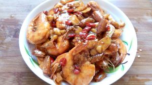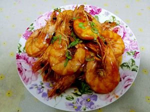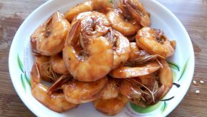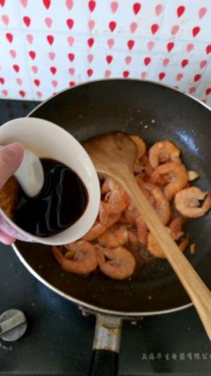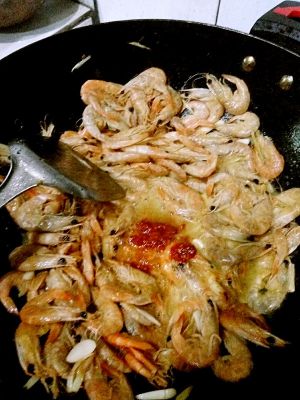 虾翻炒几下,看颜色差不多,放些辣酱,少许白糖,提升味道。