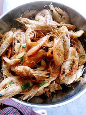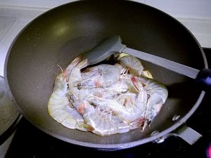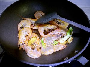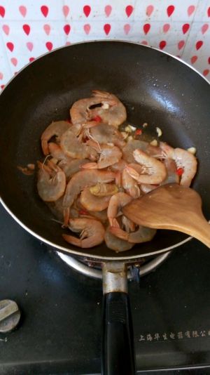 蒜,姜,小米椒爆香,加入虾翻炒,按压虾头位置,让虾黄流出,味道更鲜美