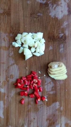 大蒜,生姜,小米椒切碎(家人不喜欢吃生姜,所以这里切大片,方便挑出来)