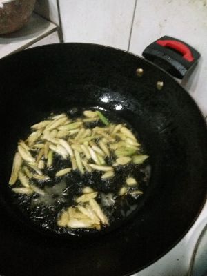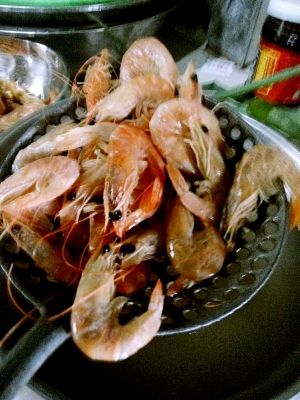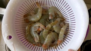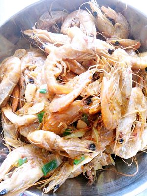没有活虾。正好家里有干虾,就将就这用,烧开水把干虾用水焯水,然后漏勺把水滤下,备用。
