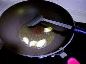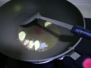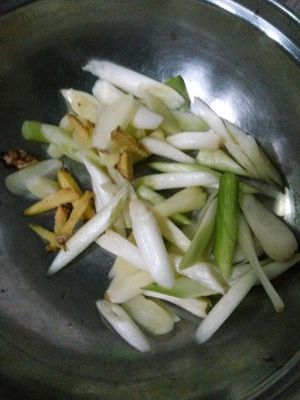 倒入炒好的蒜姜沫,加一勺生抽,一勺料酒。