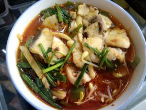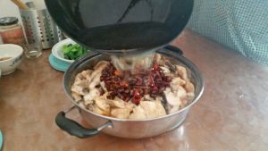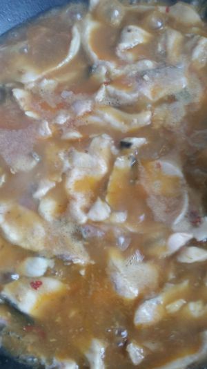加水烧开后倒入鱼骨大火煮五分钟。然后把腌制好的鱼片放入锅内再煮三分钟,加鸡精起锅。