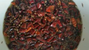 将辣椒段儿,八角,桂皮,花椒,麻椒按照鱼的大小,放适量的比重在盆中,油热后陆续导入放有香料的盆中,注意别把盆中香料淋糊了!提示:麻椒和花椒在后期放入盆中最好,以免淋糊了!备用。