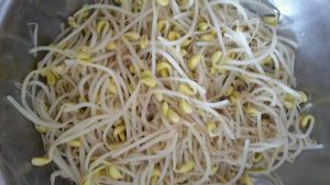 将黄豆芽菜洗净,焯水,焯水时加盐一小勺儿。