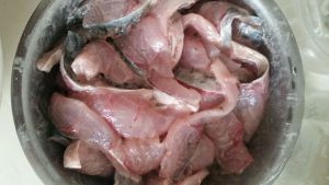 把青鱼头剁下,然后用刀从鱼头分离处,挨着主刺下刀往下,分出一边鱼肉再反过来分,现在开始片鱼片,从鱼尾往上片,片得薄薄的。主刺鱼排剁成一块块的装进容器里