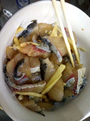鱼肉斜着切片放入盐,胡椒,料酒,淀粉,少许生抽,搅拌均匀腌制半小时后待用。鱼骨鱼头切段。