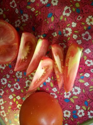 此处没拍图,锅预热,放入油和姜蒜煎一下,然后加适量盐放番茄,翻炒后加800ml左右的水,煮5分钟至番茄烂。