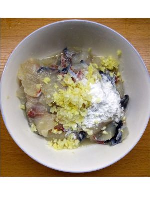 将鲤鱼撒上豆粉,料酒,盐,胡椒面,鸡精。如果偏好麻辣可以在这时加入少许辣椒面和花椒面。