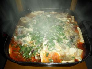 水开后倒入豆腐和未切的小葱 香菜继续煮。
