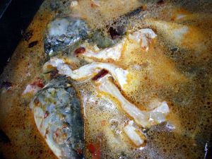 因为接下来比较忙,就不能一一拍照了。先将锅加热,放入50克菜籽油。等菜油8分熟,放入花椒粒,干辣椒,姜,蒜末。翻炒出香味,然后放入豆瓣酱翻炒出红油加入鱼头和鱼骨,大葱,芹菜段,再加入500克汤,大火煮开,放入鸡精,再熬10分钟。