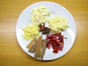 老姜,大蒜切成末。干红辣椒用手撕碎。花椒粒,八角(可以不要)