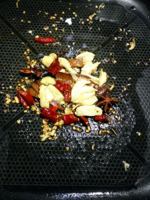 加入底油,中火等油热后倒入切好的姜蒜片和八角 干辣椒段 桂皮进去煸炒。