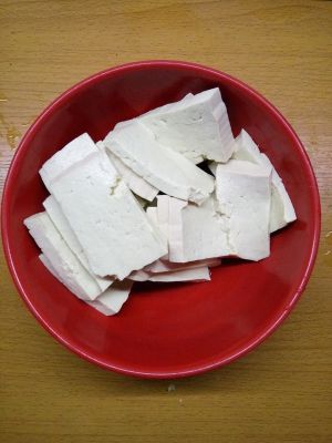 豆腐用水淋一下切成5毫米左右的厚片,豆芽洗净即可。