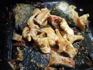 大蒜煸炒变黄后倒入豆瓣 鱼头 鱼尾 鱼骨一起煸炒。