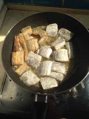 锅中倒油,待油热后放入鱼段,炸至金黄,再放入葱姜蒜末,最后倒入调料汁。