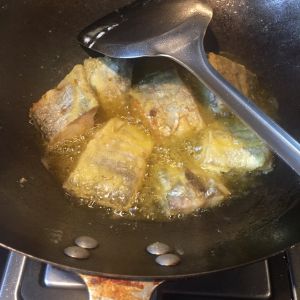 锅里放平时炒菜两三倍左右的油,油热后一根一根放入带鱼,煎的过程中用中小火,可以晃动锅但不要来回翻带鱼,等一边完全煎好再翻至另一边煎,否则带鱼容易碎,煎完后盛出