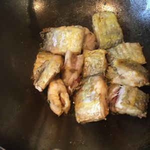 将煎好的带鱼捞出把多余的油沥出,锅内放切碎的生姜、葱末,少许油大火加热放入带鱼,陆续加料酒、生抽、老抽、糖、醋、少许开水!盖锅焖两分钟,加入鸡精出锅!