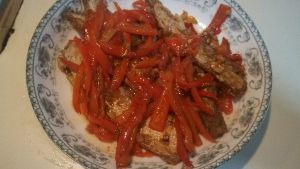 再次开火,将蒜和红椒丝放入锅里炒香,下入煎好的带鱼,轻轻翻炒,倒入调好的小碗酱汁,盖锅盖煮五分钟左右,起锅