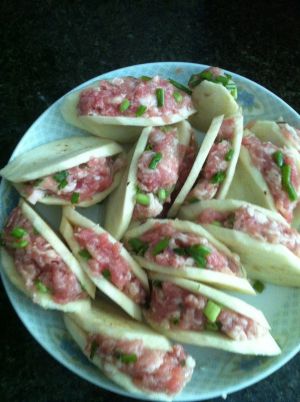 肉馅预先用材料腌好,酿在缝里,下油锅煎两面金色,再加水焖,加上蒜蓉姜溶,调好味道就装碟了~
