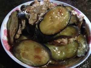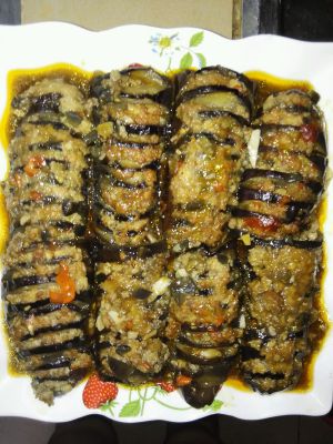 把茄子削皮切片(要厚点)中间留一点不要切断,然后就可以将肉放到两片茄子中间压实就行了