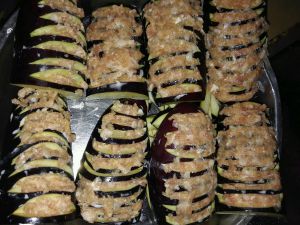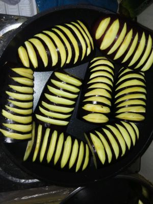 在锅里放入适量的油,温热,把茄子整齐的放入锅里,煎到一边的肉发白,放入适量的水,用锅铲把茄子稍稍铲一下,大关,盖锅盖,五分钟,(期间可以调粉水)看下茄子是否熟了,加入生抽,盐,煮一分钟,放入调好的粉水,待收汁,关火,装盘