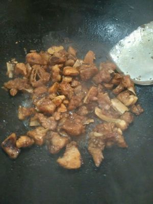 剩余的油倒出,放少许清水加冰糖熬至焦黄。