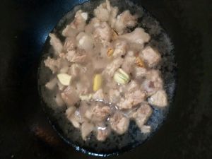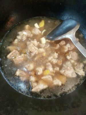 热锅,放油适量,倒入排骨翻炒片刻,倒入清水没过排骨,加入姜片,蒜。