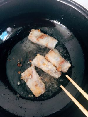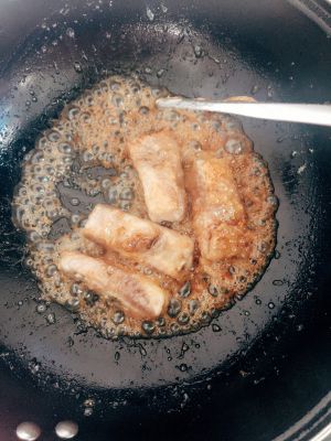 锅内放油七成热放入排骨炸至金黄捞出沥干。