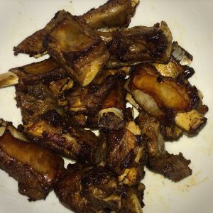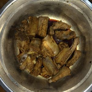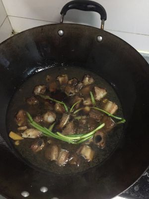 锅内留少许油,加蒜、姜煸炒出香味后加排骨一起翻炒,然后加料酒、生抽、白糖、醋、肉汤(比例1:2:3:4)焖煮