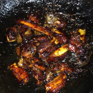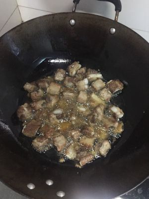 起热锅凉油,下冰糖,炒化后放入焯好的排骨。
