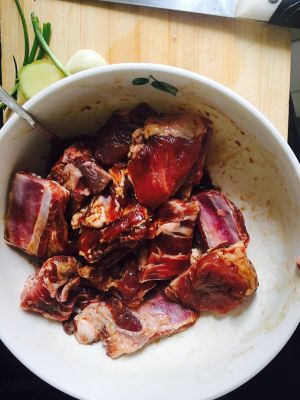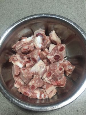 将排骨洗净,按照上述的2勺料酒1勺酱油小半勺盐进行腌制。腌制时间大约1个小时