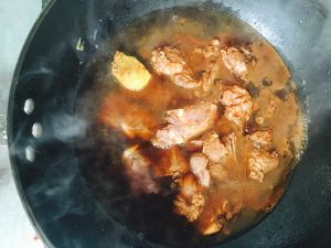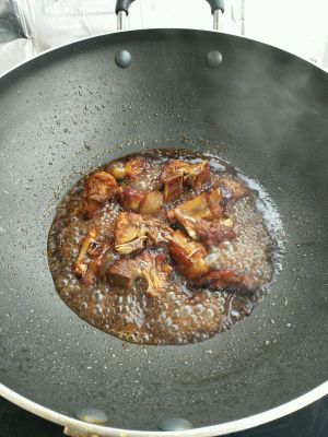 将排骨倒锅里,加入腌制排骨剩下的调料,煮排骨的水一碗,三勺白糖,一点点盐,小火焖至收汁。