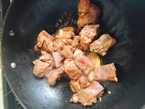 葱姜入锅煸好,倒入排骨,注意排骨尽量不要用水焯,直接入锅炒至焦黄。