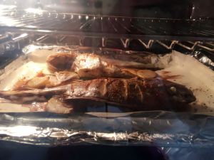 预热烤箱220度,把鱼放入,烤30分钟,15分钟时给鱼翻面继续烤,烤箱的温度各有不同,大家自行掌握调整就好