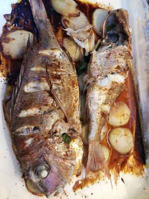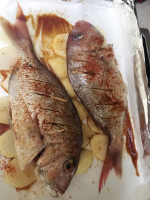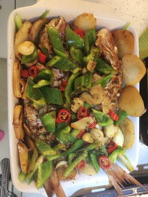 烤箱到家,第一道菜尝试下,买鱼时告知卖鱼的,用来做烤鱼,他懂的。只有成品图,忘记拍中间了,这次就不拍了。先腌制鱼,两面摸上盐,撒上料酒,姜片。好啦可以坐其他的了。