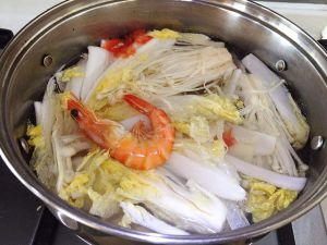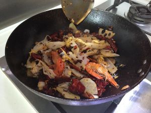 锅里倒入炸好的虾和鸡翅,翻炒2~3分钟后,在加入莲藕,红薯条,香菇,金针菇炒1分钟,最后加入之前煮好的所有蔬菜,粉条,豆皮,炒3分钟,出锅时加入香菜和小葱。