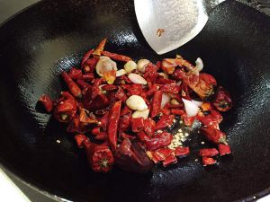 等葱蒜的味道炝出来的时候。这时候放小茴香和桂皮,家里要是没有,可以忽略不放。 (辣椒的香味不要太好闻啊~~)