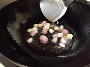 接着,把切好的葱 姜 蒜都扔进锅里,切的大片点。 多到点油、开中小火
