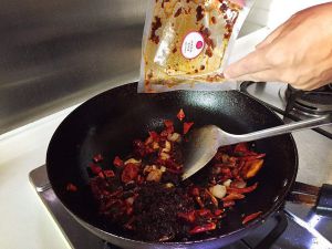 倒入准备好的麻辣香锅底料,生抽,老抽,蚝油。