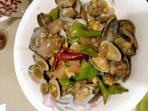 下花蛤爆炒,等开了,下盐,鸡精和薄壳草,如图是起锅前的状态