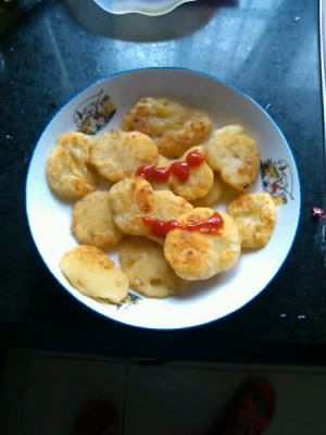 平底锅倒油,烧至七成热,放入第三步的成品,煎至两面金黄即可。吃的时候沾上番茄酱食用。