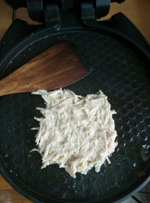手上戴一个一次性手套,用手把土豆饼弄成型放电饼铛内。