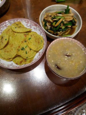 美味的土豆饼,配上一碗红枣小米粥,一份可口的蒜苗烧蘑菇,是不是很有食欲的