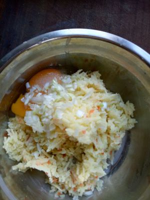 剁碎,加入鸡蛋,葱碎,盐,搅拌均匀,放在电饼铛里煎到两面金黄就可以了。